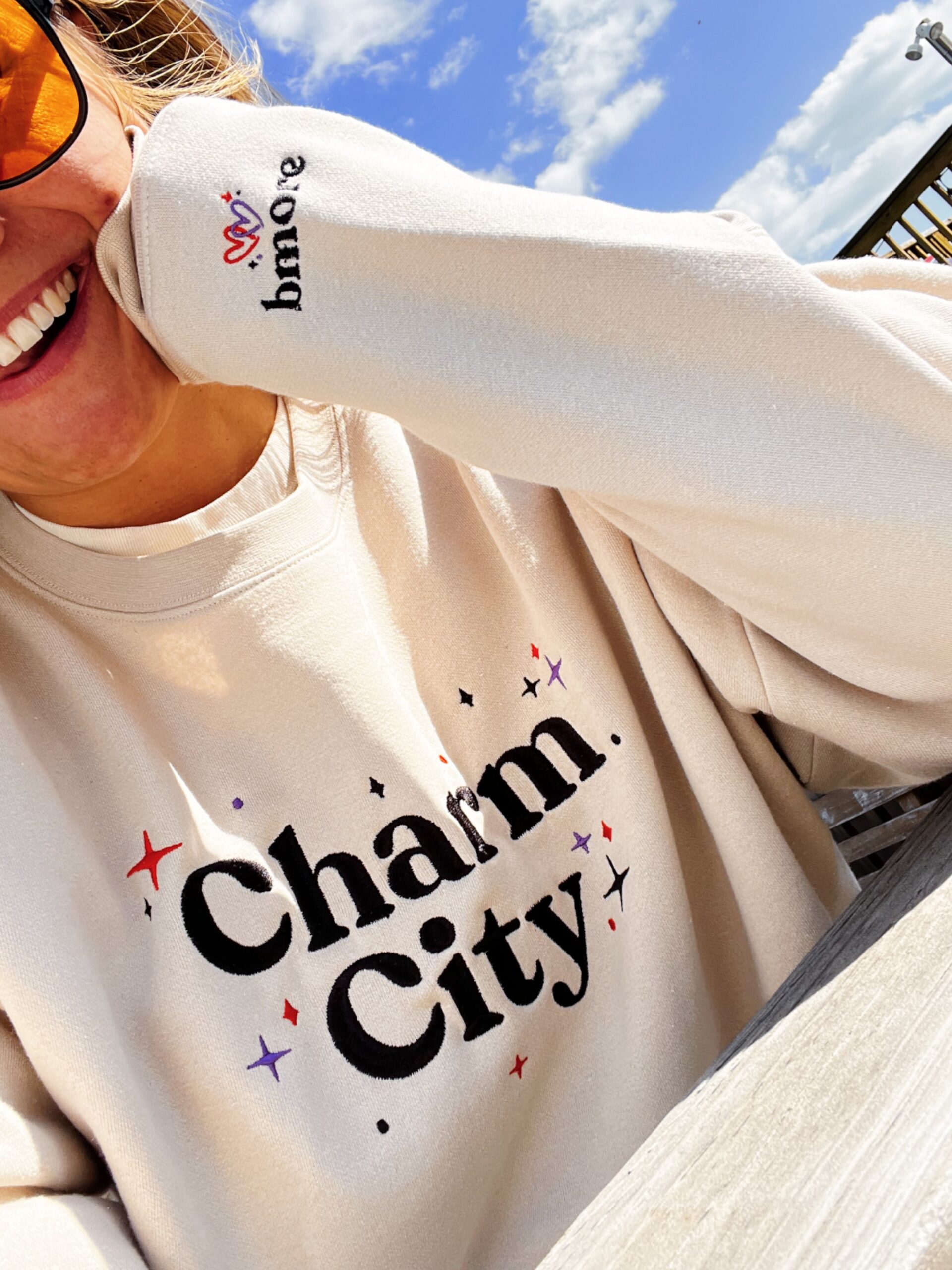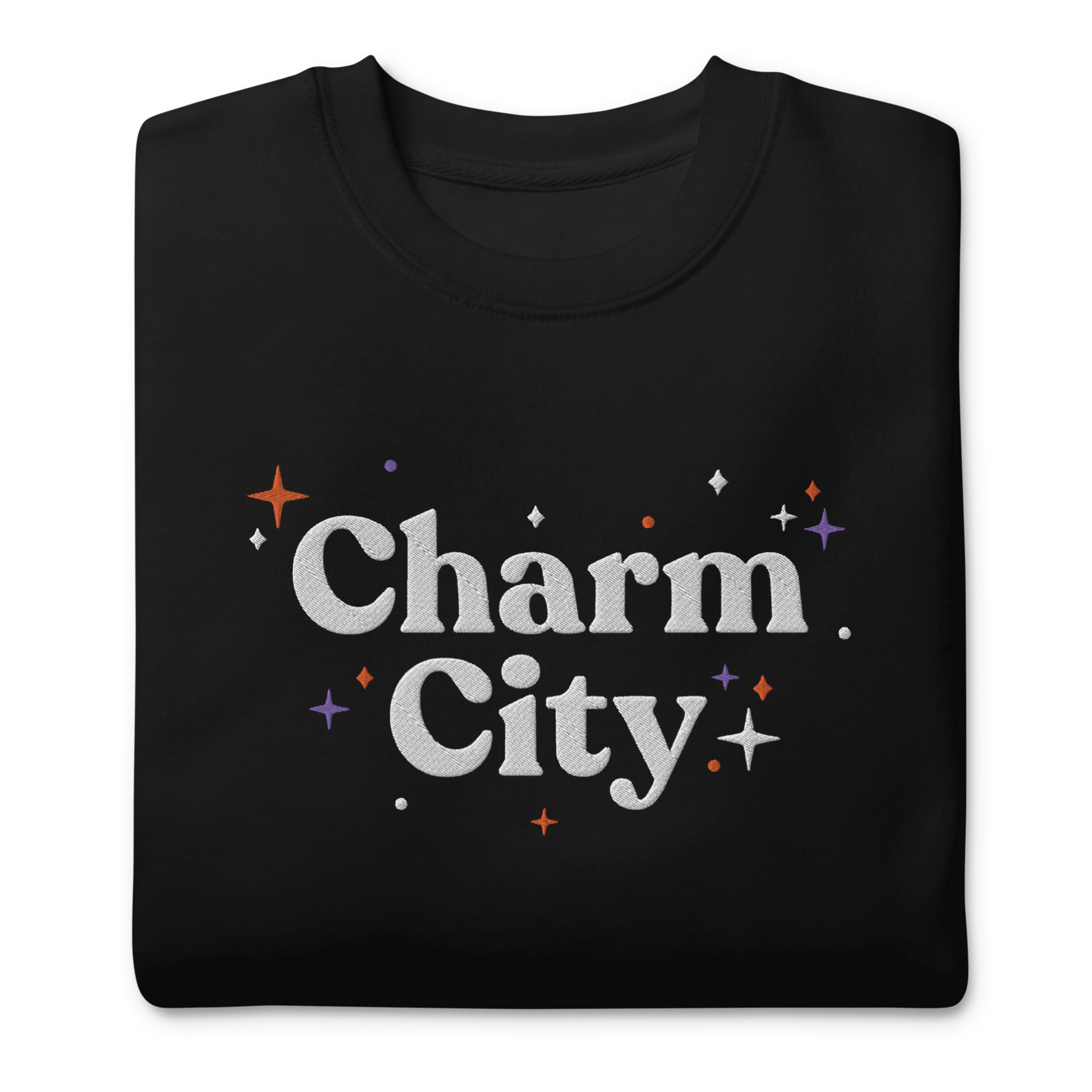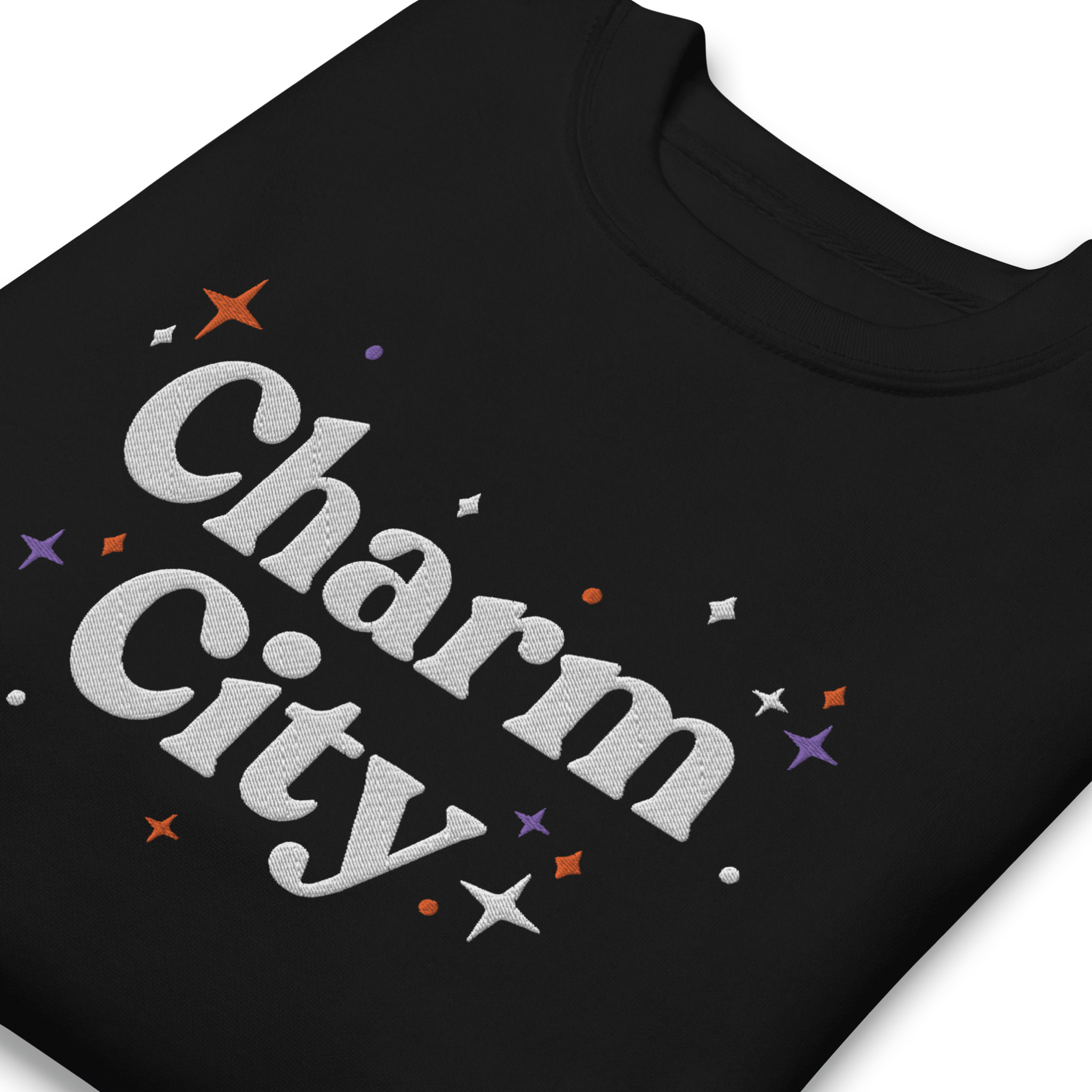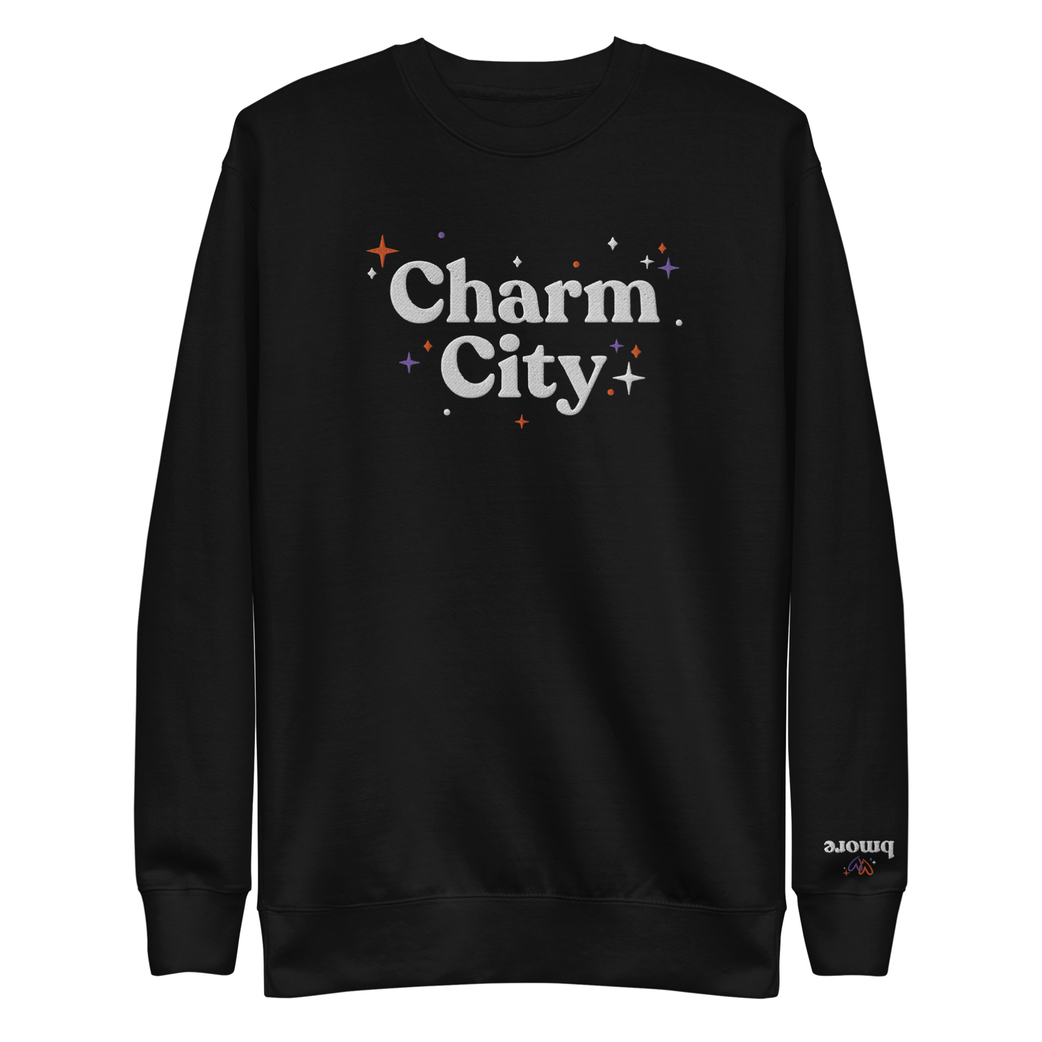 Show off your Baltimore pride with a touch of glitz and glamour in our “Charm City” Sparkle Embroidered Crewneck. The design proudly displays “Charm City” front and center and a little <3 bmore subtly on the left wrist. Whether you’re a lifelong Baltimorean or a passionate fan, this shirt is your new go-to for showcasing your Charm City pride with a bit of sparkle. Hand screen printed at Makemore HQ on Cotton Heritage Premium Crewneck Sweatshirt.